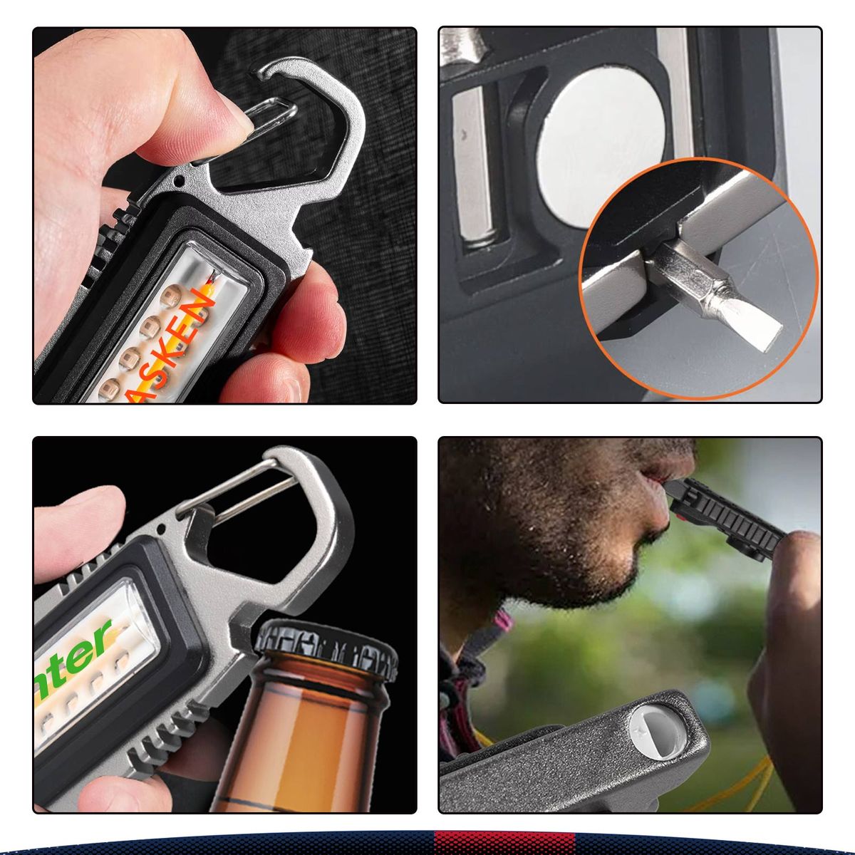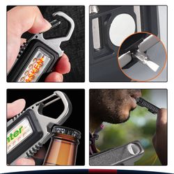 ?The Rynor Multifunctional COB LED Keychain Flashlight packs multiple tools into one pocket-sized design. Crafted from durable ABS, PS, and aluminum with daily waterproof performance, this versatile flashlight features a strong magnetic back for hands-free illumination on any metal surface. It comes equipped with two built-in screwdrivers—a 3.0 flathead and a 3.0 Phillips—for quick fixes, while the integrated bottle opener and survival whistle add outdoor versatility. Designed with a spring-loaded carabiner clip, it securely attaches to backpacks, belts, or keychains for easy carrying. Powered by a 400mAh rechargeable battery with Type-C charging (cable included), it delivers hours of reliable light across three modes—high yellow light, low yellow light, and red-blue strobe for emergencies. Perfect for everyday carry, outdoor adventures, camping, emergency kits, and quick repairs.
